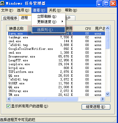 第四步:在任務管理器中, 點擊菜單上的查看--選擇列,然後在PID(進程標示符)前麵打鉤。