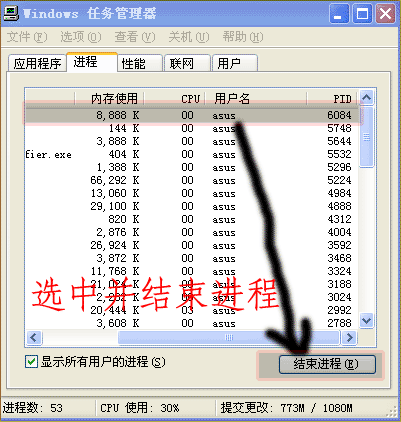 第五步:上圖點擊“確定”後,我們可以看到進程都有了PID號碼。這時候根據第二步找到PID6084,在這裏找到相對應的6084進程,結束進程,如下圖所示: