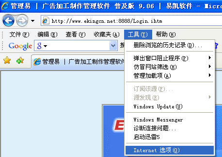 打印業務單,有的電腦可以看到打印窗口,但有的看不到?出現這種情況主要是Internet Explorer瀏覽器的設置問題,導致彈出的打印窗口出現在IE選項卡上,被之前的彈出窗口擋在後麵,用戶看不到。請按照以下提示對IE瀏覽器進行設置: 第一步:點擊IE菜單上的“工具(T)”,點擊“Internet選項(o)”: