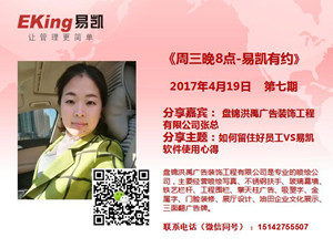 2017年4月19日《周三晚8點-易凱有約》第七期由盤錦洪禹廣告張總分享,主題是“如何留住好員工VS易凱軟件使用心得” >>詳細
