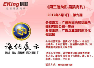 2017年3月29日《周三晚8點-易凱有約》第五期由衛輝金利得廣告張總分享,主題是“如何從線下到線上拓展廣告標識行業的未來之路” >>詳細