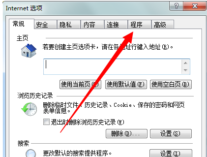 2.進入Internet屬性對話框,點擊上方菜單欄【程序】選項