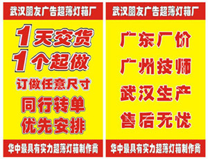 武漢朋友燈箱廠(武漢朋友時代廣告傳播有限公司),專注、專一、專業、從事廣告燈箱的設計、生產、銷售;自2008年成立以來,始終堅守“物美價廉”、“質量第一”、“誠信為本”、“用心服務”為鐵律,不斷創新,勇於開拓,經過多年的不懈努力,現已成為湖北省廣告燈箱行業的佼佼者,華中具實力燈箱製作商之一!主要產品:導光板單/雙麵超薄燈箱、LED超薄燈箱、LED磁吸燈箱、肯德基式餐飲燈箱、EEFL超亮燈箱、大型超亮LED拉布燈箱、LED側麵翻蓋拉布燈箱、LED無邊卡布燈箱、COCO奶茶燈箱等批量生產。