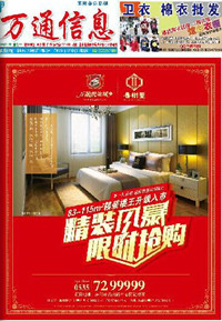萬通信息廣告有限公司成立於2003年9月,目前在威海、文登、榮成、乳山、萊陽、海陽、棲霞、煙台、萊西、東營、菏澤、德州、臨沂、濟寧、寧夏等地設有分公司,可以跨地區發布廣告,比如客戶的招商、招聘或銷售等廣告既可在萊陽萬通信息發布,又可續費在別的地區萬通信息聯發廣告,萊陽《萬通信息》報每周兩期,周一、周四發行,每期發行數量6萬份;報紙的發行對象包括萊陽市所有的門市房、黨政機關、企、事業單位、商場、寫字樓、學校、醫院、開發區、部分高檔居民小區等;大型超市門前、大型商場內、公交站點、幼兒園放學及鄉鎮小客運站散發;發行範圍十分廣泛,覆蓋萊陽市城區、17個鄉鎮及一個經濟開發區,東到山前店龍大龍旺莊、西到馮格莊桃源莊、北到譚格莊、沐浴店、榆科頂、南到羊郡、穴坊及萊西市河頭店鎮。萬通廣告還是萊陽實現報刊與網絡相結合的廣告媒體,隻要在《萬通信息》報上刊登廣告,無論價錢多少,均每期刊登在齊魯供求網上免費發布,隻要點擊齊魯供求網站www.qlgongqiu.com,點在線讀報,就能看到數家萬通廣告公司的DMguanggao,neirongquanmian,xiaoguofeifan。wantongxinxizichengliyilai,dedaoleguangdakehujiduzhededalizhichi。wantongxinxidekehuqunzhujiankuodazengjia,shejidexingyebuduanzengduo,xinxiliangbuduanzengjia,kehuqiandanshijianyuelaiyuechang,banmianshuliangbuduanzengjia,muqianyiyouyuanlaidemeizhouyiqigaiweimeizhouliangqi;由每期四版增至為每期16版至24版。