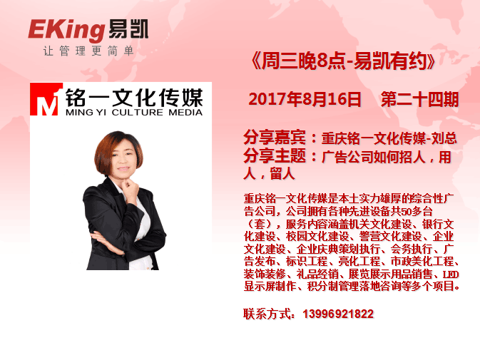2017年8月16日《周三晚8點-易凱有約》第二十四期,由重慶銘一文化傳媒劉總分享,主題是“廣告公司如何招人、用人、留人”