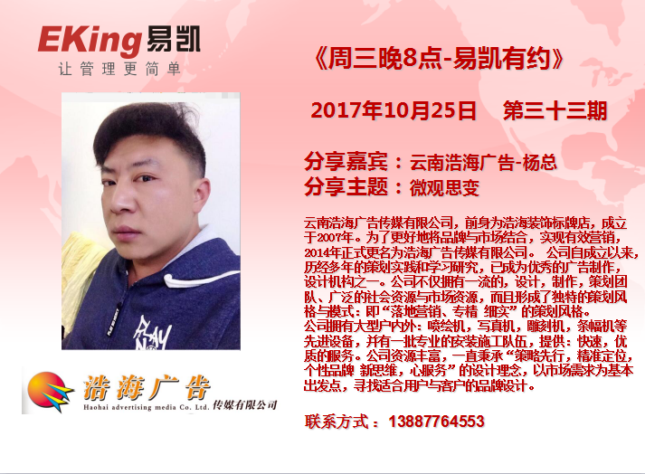 2017年10月25號《周三晚8點-易凱有約》第三十三期由雲南浩海廣告楊總分享,主題是:“微觀思變”。