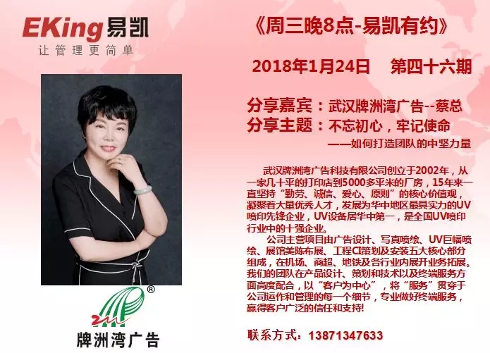 2018年1月24日《周三晚8點-易凱有約》第四十六期由武漢牌洲灣廣告蔡總分享,分享主題是:不忘初心,牢記使命--如何打造團隊的中堅力量。