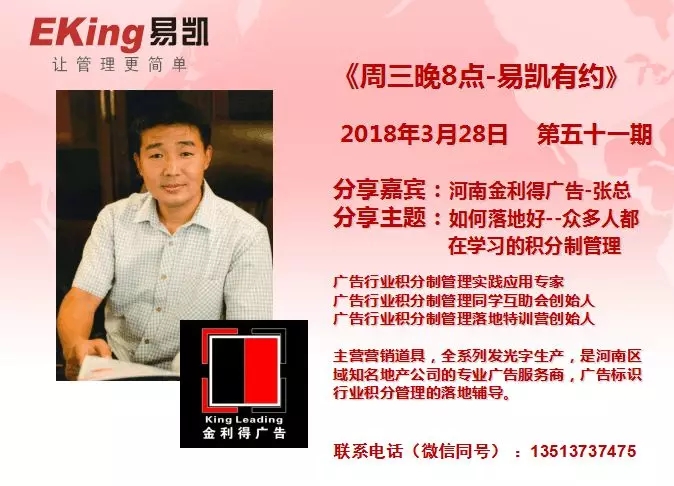 2018年3月28日《周三晚8點-易凱有約》第五十一期由河南金利得廣告張總分享,分享主題是:如何落地好--眾多人都在學習的積分製管理。
