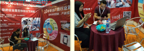 易凱軟件在2號館入口左側安排兩個展位接待新老客戶。有用戶帶著問題前來交流,易凱客服小敏在展會現場為易凱用戶指導應用,交流管理。