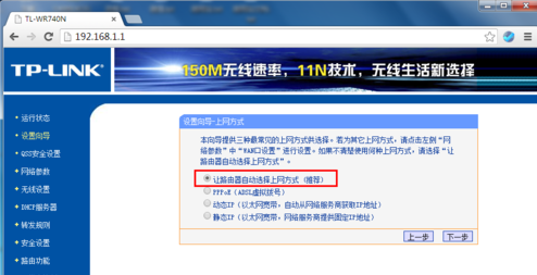 在“設置向導-上網方式”界麵,選擇“讓路由器自動選擇上網方式”選項,點擊“下一步”,如下圖:
