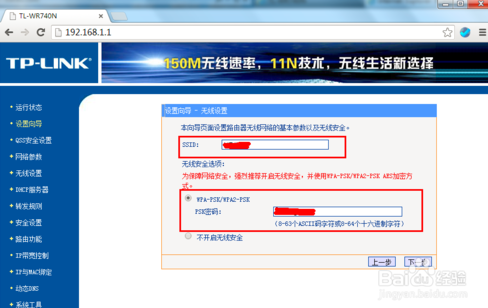 在TP-LINK路由器左邊找到“設置向導”,點擊進入設置向導界麵,在設置向導界麵點擊“下一步”,如下圖: