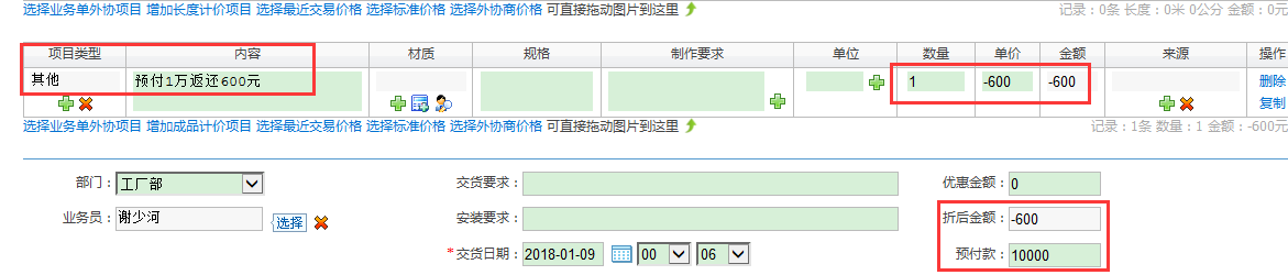 問:我給外協商打了10000,對方多送我600,這個怎麼記錄到係統?