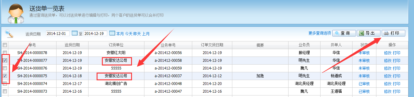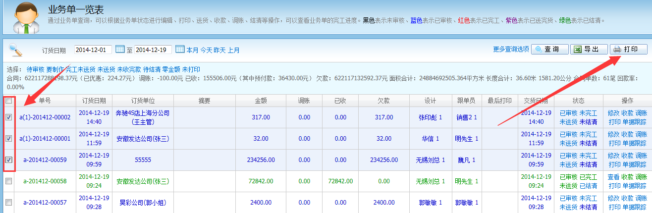 答:可以的,在業務單一覽表,勾選要打印的業務單,再後點打印,如下圖