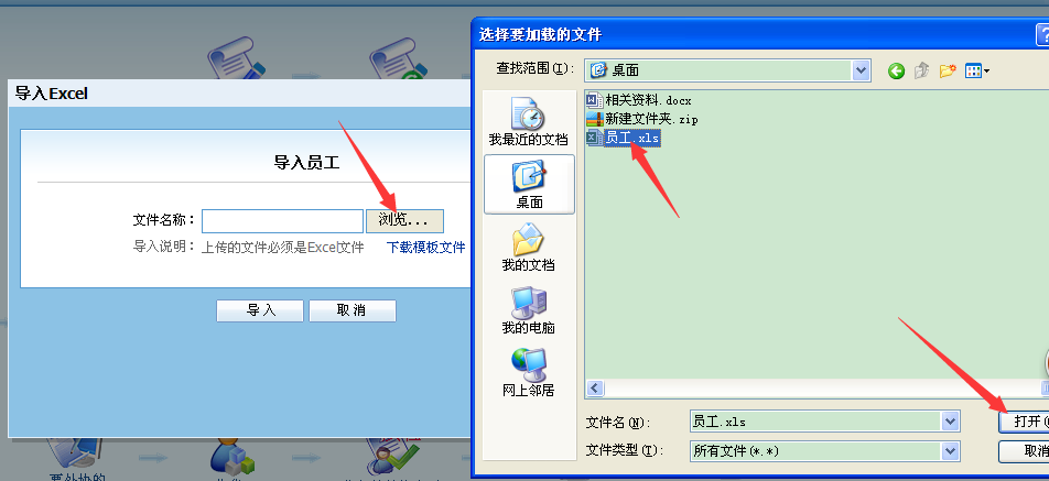 填好表格後保存,重新打開係統管理——導入員工,點擊"瀏覽",選中文件