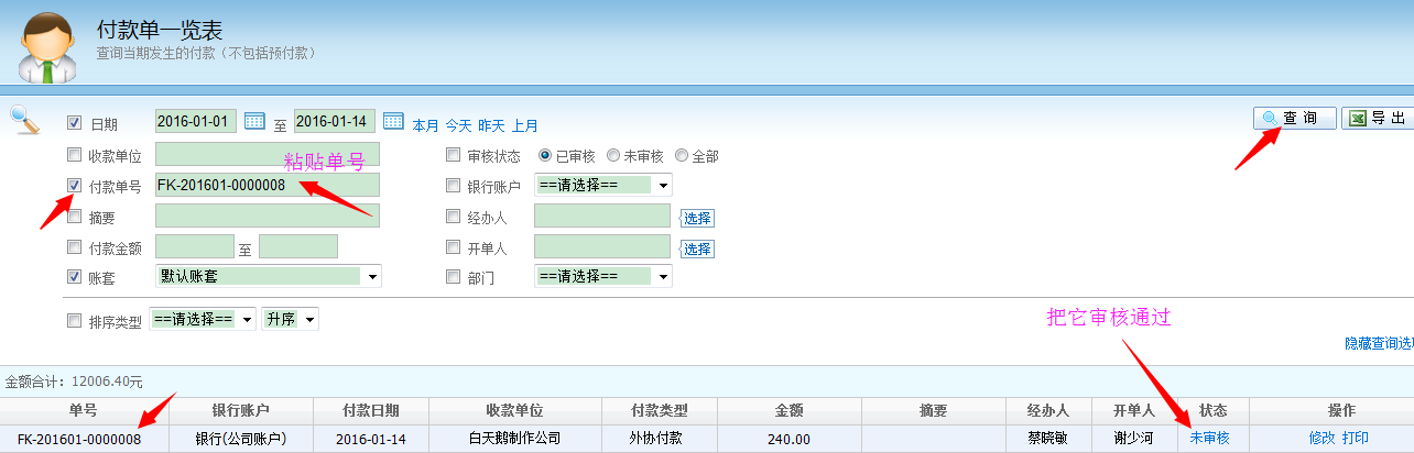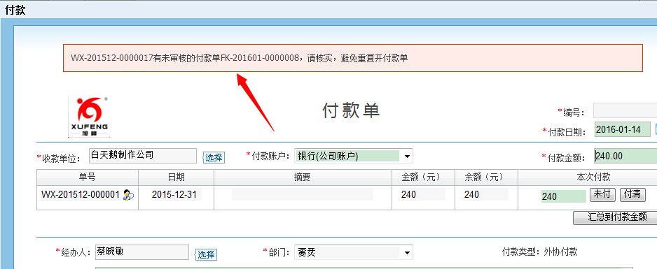 解決方法如下: 複製提示上麵的付款單單號“FK-201601-0000008”,然後在付款單一覽表查詢,把它審核通過就行了。