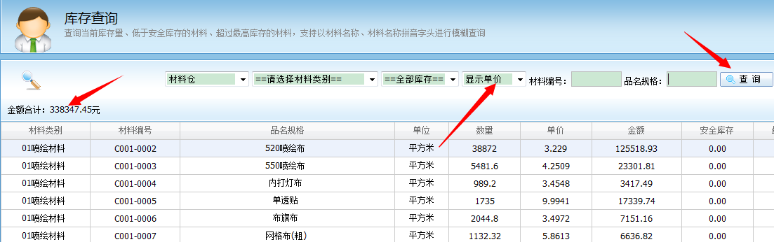 選擇好倉庫,並選擇“顯示單價”,再點擊“查詢”,就可以看到統計欄的金額了。
