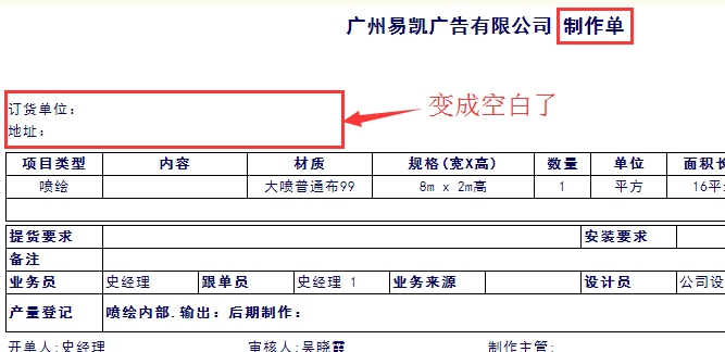 以下是正常的製作單,顯示了訂貨單位、聯係電話、送貨地址等信息。