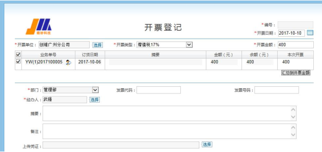 可以對業務單進行開票登記,操作和收款單類似。(如果業務單沒有選擇開票類型,則該業務單不出現在開票界麵上,不需要做開票登記)