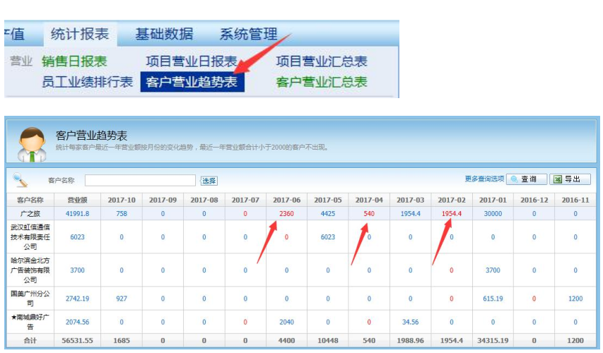 紅色字體表示相比上個月,營業額下降了,通過這個報表可以發現哪家客戶營業額異常變化,及時跟進處理。