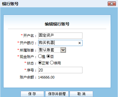 1、進入 基礎數據 - 銀行賬戶,建立 一個賬戶,選擇非現金,賬戶名 = 固定資產,銀行=自定義的科目,例如購買機器,購買工具等等: