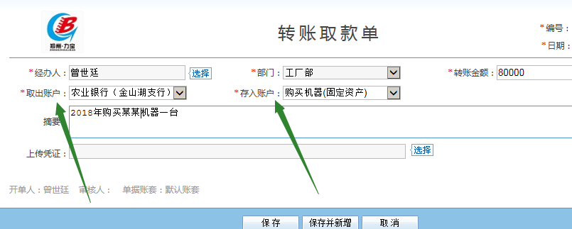2、購買固定資產=開轉賬取款單,進入賬務--轉賬取款單,支出賬戶選擇實際付款的賬戶,收入賬戶選擇“固定資產”,金額=購買固定資產的金額,摘要錄入此次購買資產的說明,有購買憑證的可以在下方的上傳憑證處選擇上傳: