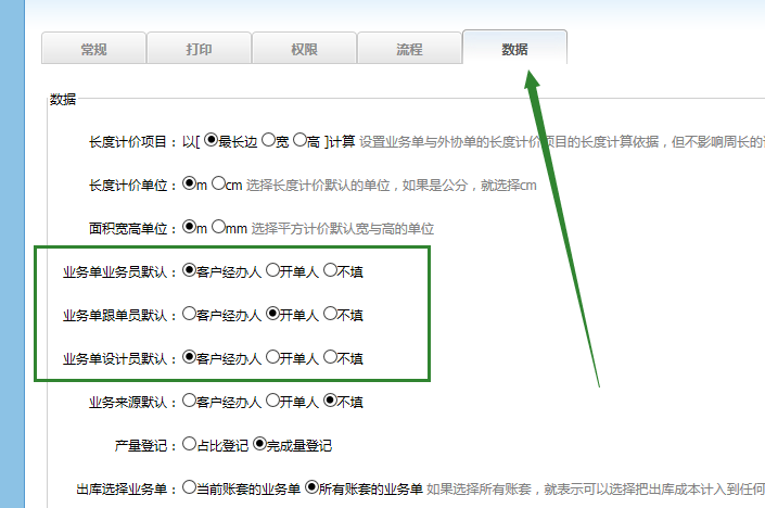開業務單可以設置默認的業務員、設計員、跟單員為客戶的經辦人或者是開單人或者是留空,進入係統管理--係統配置--數據,選擇相應的設置即可: