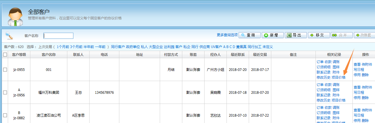 一、進入客戶業務--全部客戶,這裏每個客戶後方都有一個項目價格