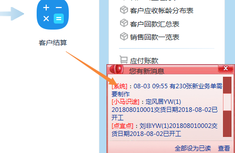 設置好之後,如果有新的業務單保存並審核通過,在軟件登錄界麵,係統就會自動發送消息提醒到我們設置的接收人員