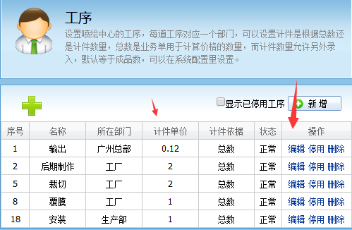 點擊編輯,設置工序的計件單價,如下圖為表示輸出這道工序一平方產值是0.12,後期製作這道工序一平方產值是4,以此類推