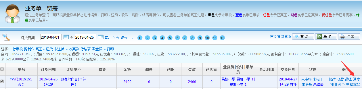 如果我們想查看這個訂單目前的進度,可以進入客戶業務--業務單一覽表,點擊這個訂單的“進度”