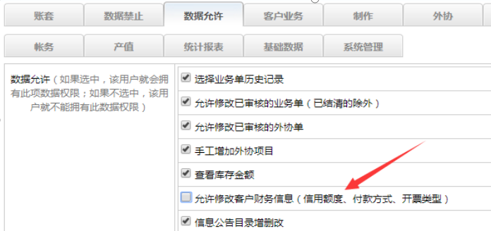 1、在【係統管理】-【用戶授權】-【授權】,在“數據允許”裏,不要勾選“允許修改客戶財務信息(信用額度、付款方式、開票類型)”。