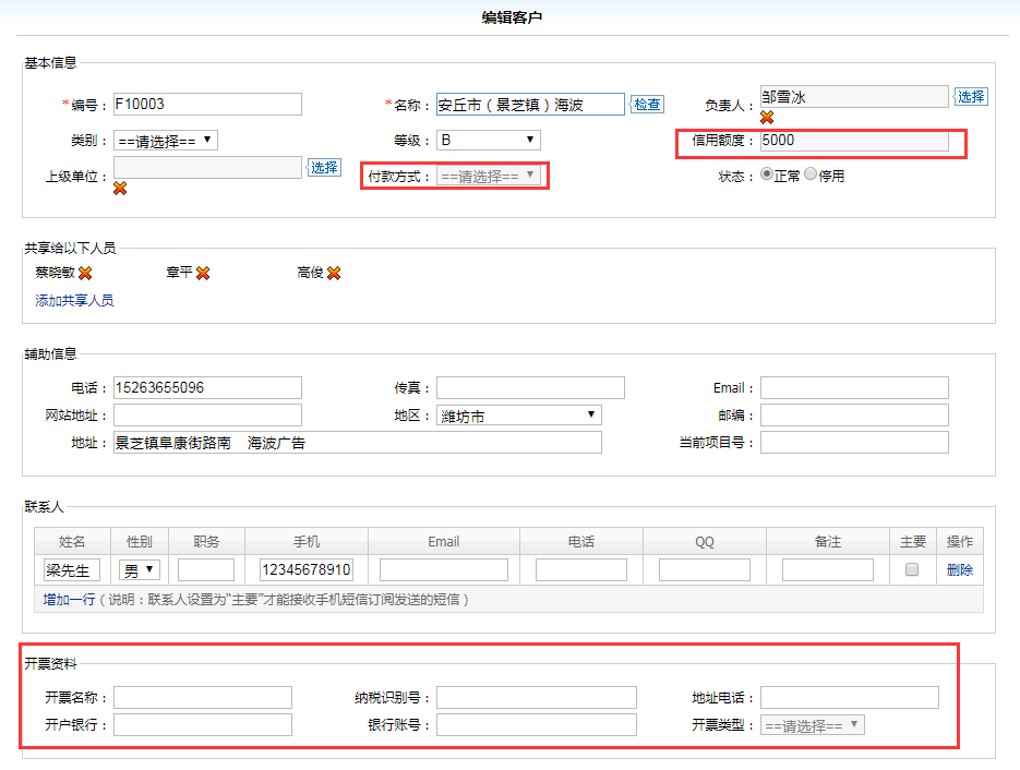 對於客戶的一些關鍵財務信息,允許通過權限設置,授權某個員工的賬號是否允許修改,以此確保結算信息的準確。財務信息包含:信用額度、付款方式、開票類型。