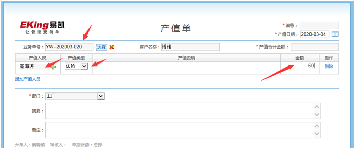 3.登記送貨人員的產值--開產值單,選擇對應的業務單號,產值人員等於送貨人員,產值類型選擇送貨,金額等於產值,保存產值單即可