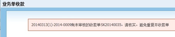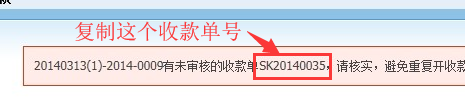解決方法如下: 複製提示上麵的收款單單號“SK20140035”,然後在收款單一覽表查詢,把它審核通過就行了。