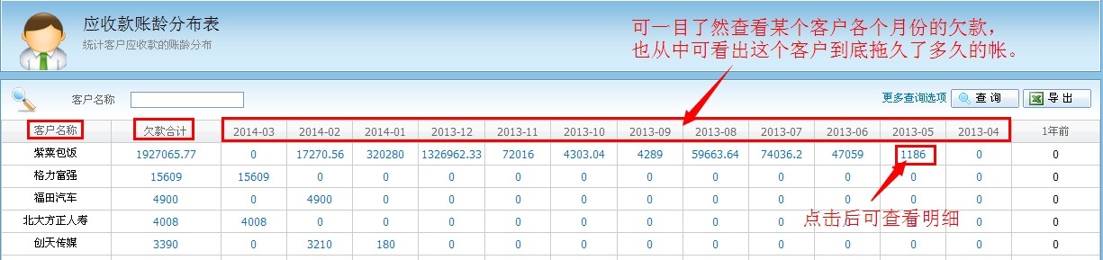 (遼寧天麒)問:軟件能否分析出某個客戶的還款情況?諸如欠款明細以及到底拖欠了多久的賬還未還等。