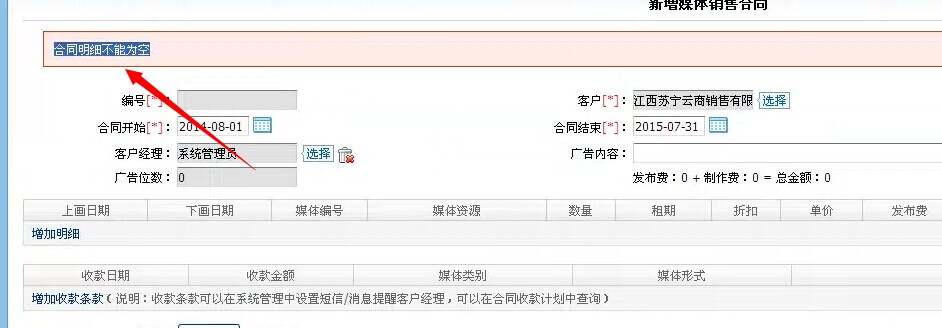 答:新增合同的時候,不能不填內容,係統左上角會提示