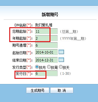 河北三信DM廣告問:如何按每月的某個特定發行日新增期號呢?例如每月的1、6、11、16、21、26日發布。