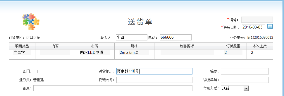 先開第一個項目的送貨單,填寫好送貨地址和聯係人信息,把第二個項目的送貨數量設置為0,保存並審核