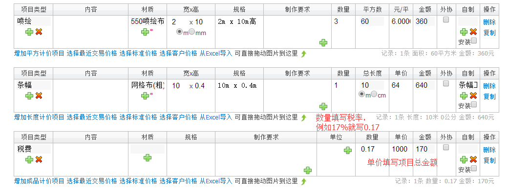 然後新增按成品計價項目, 項目類型為“稅費”,數量填寫稅率,單價為業務總金額,如下圖: