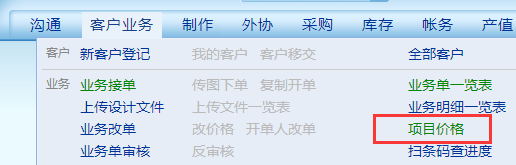 點擊客戶業務,選擇項目價格,如下圖: