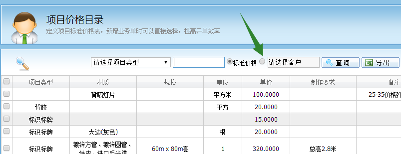 進入項目價格的界麵,點擊“選擇客戶”前麵的單選框: