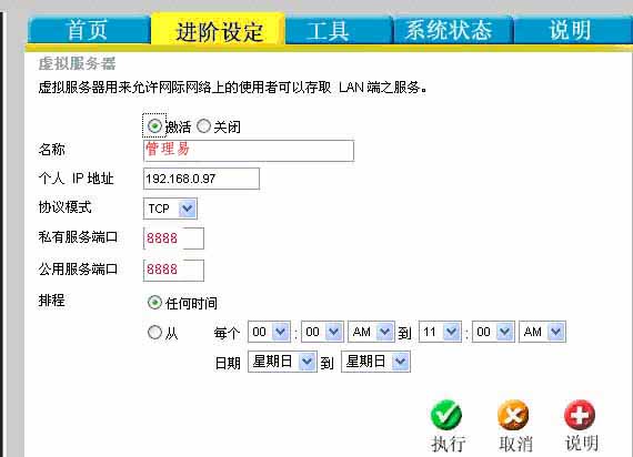 步驟2:設置虛擬服務器或者端口轉發,隻有正確設置了虛擬服務器或者端口轉發,才能實現異地訪問。