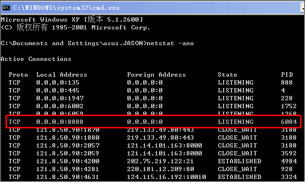 第二步:在窗口提示符後輸入netstat -ano,然後回車,找到tcp 8888端口對應的pid,比如6084,如下圖所示:
