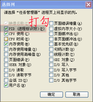 第四步:在任務管理器中, 點擊菜單上的查看--選擇列,然後在PID(進程標示符)前麵打鉤。