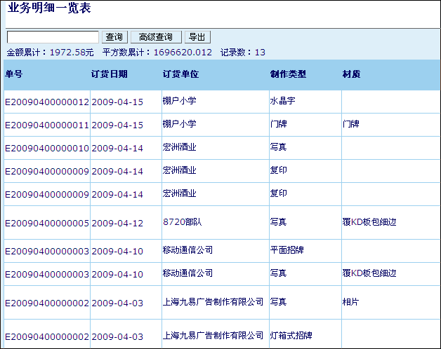 點評:此項功能推出,可以快速查詢客戶某個以前的業務單以及單的具體內容,不需要逐個單去點擊查看,而且還可以根據日期、業務單狀態、經辦人、訂貨單位、業務單號、部門、訂貨金額、設計人員、製作類型、成品內容、製作要求、地區、單位類別、單位等級等條件進行查詢,查詢結果可以導出到Excel表。