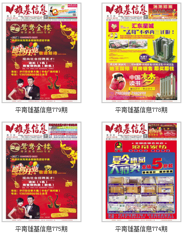 廣西雄基信息廣告公司創於二00三年十二月一日,現全國擁有近50家分公司(廣西區內各市、縣擁有達40多家分公司,從最初的1家發展到現在全區40多家分公司,南寧分公司從最初每期發行量1萬份到現在每期6萬份,從最初的4版到現在的8版,從最初的單一DM媒介到現在的報紙、網絡、戶外、公交等多向發展,並成為廣西DM廣告公司。貴港平南分公司網址:www.pingnan365.com