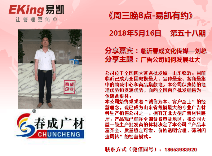 2018年5月16日《周三晚8點-易凱有約》第五十八期由臨沂春成文化傳媒劉總分享,分享主題是:廣告公司如何發展壯大。