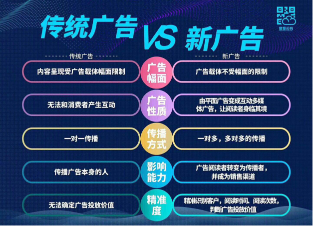 傳統廣告與新廣告有什麼不一樣?傳統廣告所呈現的內容,篇幅數限製;新廣告載體不受幅麵的限製。傳統廣告無法與消費者互動;而新媒體廣告可以由平麵廣告變成互動多媒體廣告,讓閱讀者身臨此境!傳統廣告是一對一的傳播;而多媒體廣告能夠實現一對多、多(duo)對(dui)多(duo)的(de)傳(chuan)播(bo)。傳(chuan)統(tong)廣(guang)告(gao)傳(chuan)播(bo)本(ben)身(shen)的(de)人(ren),新(xin)媒(mei)體(ti)廣(guang)告(gao)它(ta)才(cai)能(neng)夠(gou)讓(rang)閱(yue)讀(du)者(zhe)變(bian)為(wei)傳(chuan)播(bo)者(zhe),並(bing)成(cheng)為(wei)銷(xiao)售(shou)的(de)渠(qu)道(dao)。傳(chuan)統(tong)廣(guang)告(gao)無(wu)法(fa)確(que)定(ding)廣(guang)告(gao)投(tou)放(fang)價(jia)值(zhi);而新媒體廣告卻能精準識別客戶、閱讀時間、閱讀次數、判斷廣告、投放價值。