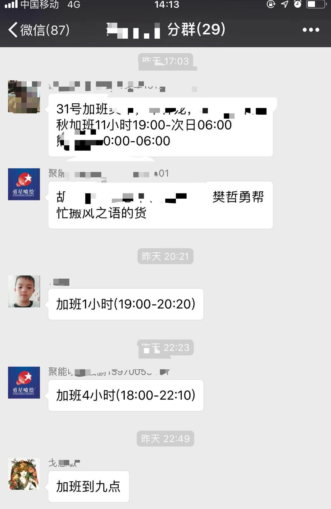 下麵我也把我們這個平常每天公司的這個加班的一些情況,包括他們加班的一些時間段,我也在我們群裏麵也截了個圖。