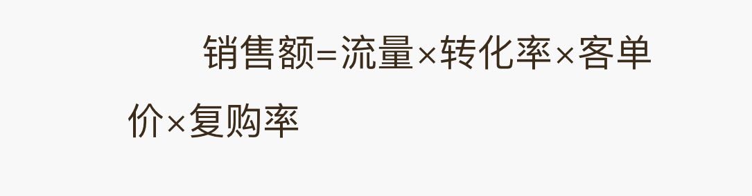 在這裏我們理解的“流量”,流量就是我們傳統說的人流量,比如說我們店鋪-旺鋪帶來的人流、客ke流liu,就jiu叫jiao流liu量liang。我wo們men通tong過guo店dian鋪pu的de外wai觀guan形xing象xiang可ke以yi吸xi引yin到dao我wo們men的de潛qian在zai客ke戶hu,潛qian在zai客ke戶hu一yi看kan我wo們men是shi做zuo廣guang告gao的de就jiu可ke能neng會hui有you進jin店dian,進jin店dian就jiu存cun在zai轉zhuan化hua率lv,進jin十shi個ge人ren可ke能neng會hui轉zhuan化hua五wu個ge或huo兩liang個ge,這zhe叫jiao轉zhuan化hua率lv。在zai轉zhuan化hua的de過guo程cheng中zhong,我wo們men其qi實shi也ye會hui有you客ke單dan價jia,客ke戶hu單dan次ci購gou買mai的de價jia格ge;複購率就是通過我們線下的廣告店的這種體驗,感覺到我們還不錯,所以後期還可以形成複購,銷售額就是由這四個變量去組成的。